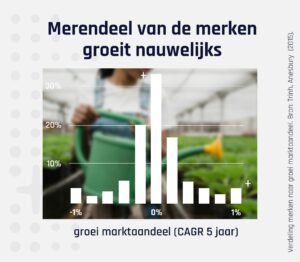 Is er geen categoriegroei, dan wordt het een ander verhaal. Groei komt dan alleen door aandeel op andere merken te veroveren en dat blijkt inderdaad lastig. Onderzoeken tonen dat het maar een klein deel van de merken lukt om meerdere jaren achtereen in aandeel te groeien.